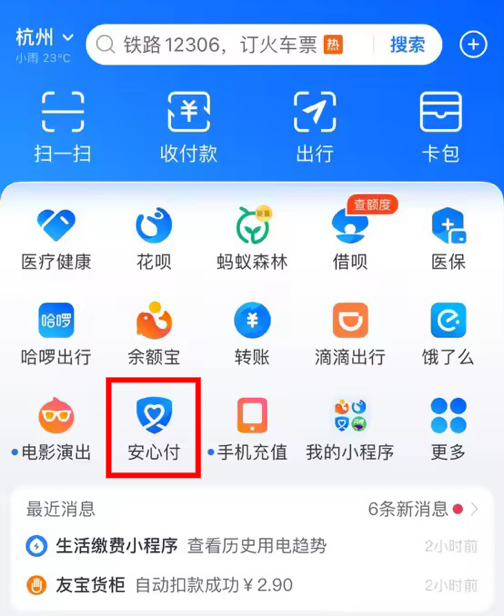 消费者购买产品后,可以将“安心付”添加至支付宝首页。下次去门店,付款时直接点击支付宝首页“安心付”即可亮码支付或自主输入金额完成扣款。