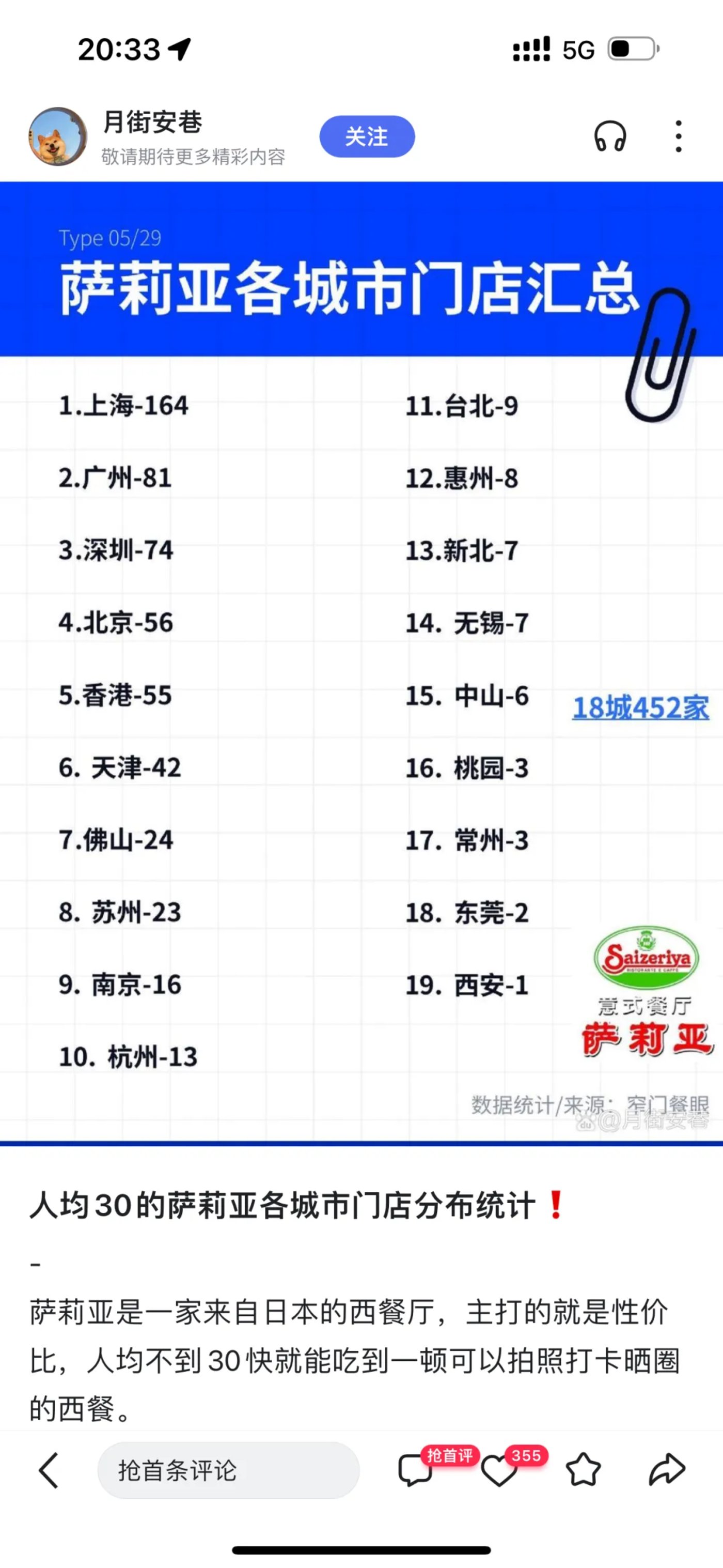 根据公开数据显示,萨莉亚中国有上海、北京、广州三家分公司。400多家门店其实就分布于上海、广州、北京等几个特大型城市中。