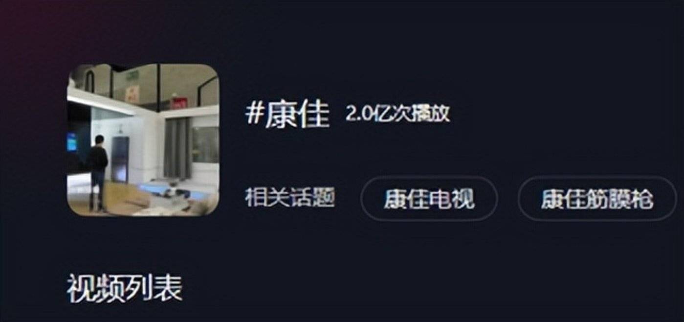 而康佳自身相关话题在抖音的播放量仅为2亿,对比美的的20.6亿和海尔的18.9亿,明显能看出在新媒体流量矩阵这块,康佳的投入或者说影响力不太够。
