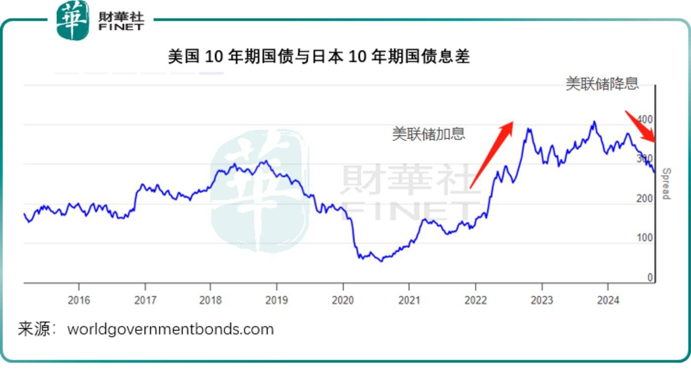 见下图,随着日本央行加息与美联储将降息的预期升温,日本10年期国库券与美国10年期国债息率之间的差额在下降。