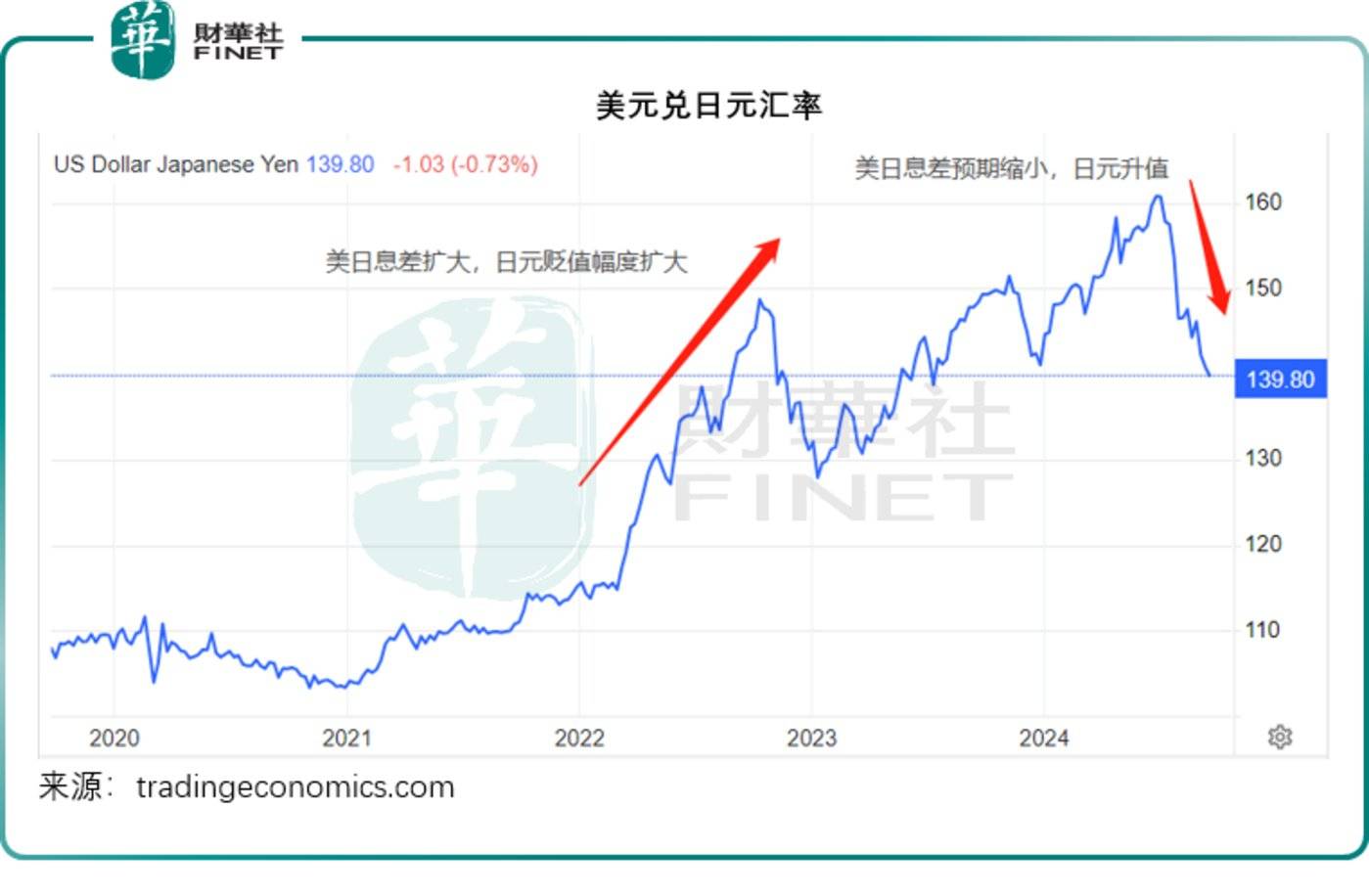 为了刺激经济,日本央行长期奉行负利率,随着美国自2022年开始加息,日本与美国的利率差持续扩大,全球交易最活跃的货币对之一美元日元货币对,也因此而被大量用于进行套息交易,加大了日元汇价的波动风险。