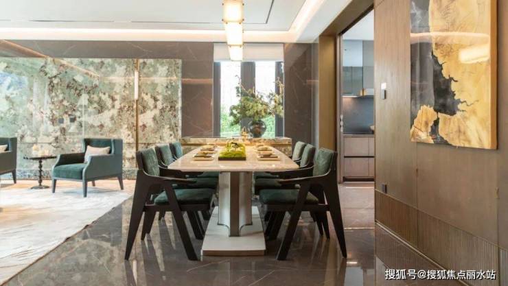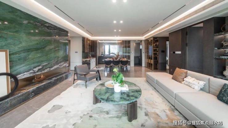 在建面约240㎡下叠样板间的空间营造上,融入传统文化元素,丰富空间层次,创造独特的室内氛围。以清新高雅的汝窑色为主调,搭配玉石般的石材背景,为室内增加空间的雅致感,营造出韵味典雅、古风盈馥的艺术气息。