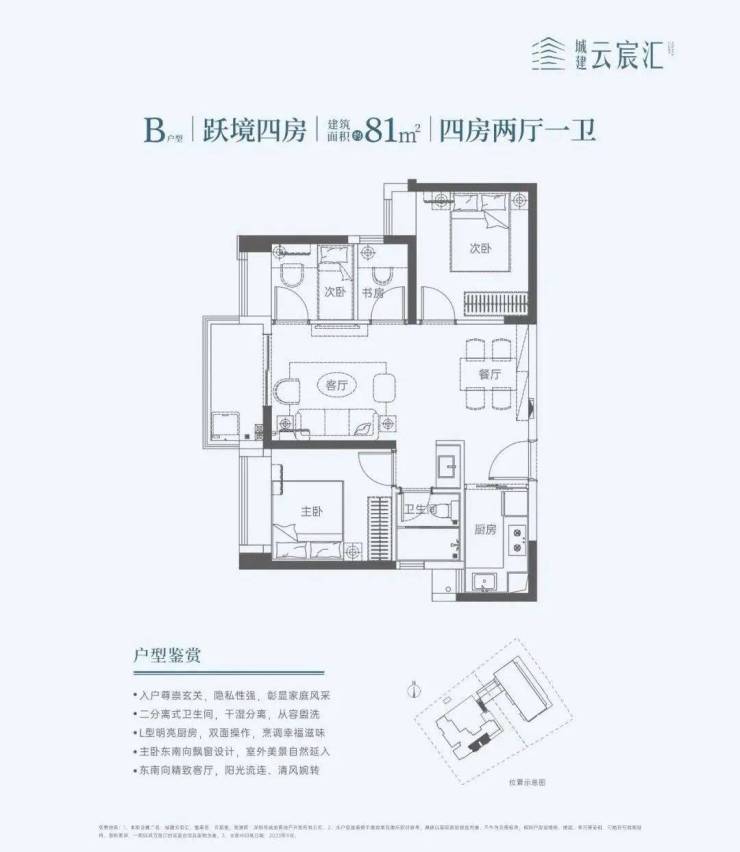 81㎡的4房2厅1卫,设计的双龙抱珠格局,餐客厅一体化,L型厨房,东南朝向,这个面积段能做到4房现在的市面上非常难得。