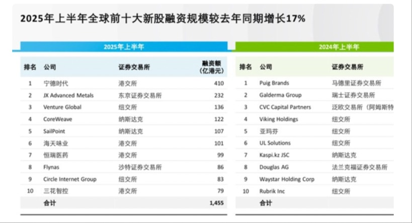 德勤发布的2025年上半年新股市场回顾数据显示,2025年上半年香港新股市场势头强劲,受惠于鼓励内地龙头企业来港上市及优化新上市申请审批流程,加上市场估值稳中向好,流动性显著改善,资金承接能力持续增强,多只大型、超大型H股上市,新股融资额较去年同期急升。其中,宁德时代、恒瑞医药、海天味业、三花智控4家公司的IPO融资额均跻身全球IPO融资额前十,宁德时代的融资额更是以约410亿港元高居榜首。