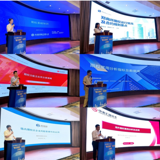 在培训环节,郑商所高级分析师、期货公司资深研究员、场外业务负责人及相关产业代表从基础理论到实务应用多维度讲解期权知识要点,涵盖市场运行情况及交易规则、期权基础及定价原理、策略运用、企业风险管理及场外衍生品应用等内容。海通期货衍生品部期权研究员刘畅围绕期权基础知识、期权定价要素、交易规则及基本应用等内容进行系统讲解,夯实学员期权理论基础。郑商所期货衍生品部相关负责人介绍了郑商所期权市场运行情况,并就郑商所期权合约设计理念与相关制度规则进行详细解读。中信期货研究所权益及期权策略组资深研究员康遵禹讲授了期权基本策略、组合策略与对冲策略等实用交易策略,分享各类策略在不同市场情形下的应用技巧。国泰君安期货金融工程首席研究员虞堪阐释了PCR、IV等期权市场常用分析指标,并借助数据库分析讲解如何利用相关指标研判市场走势。滨化集团期货管理部部长靳圻结合企业实践案例,分享了期权在企业风险管理中的典型应用,并介绍了企业内部风险控制体系的建设经验。中泰汇融资本场外衍生品部联席总经理孙亚东讲解了场外期权产品的结构设计,并通过典型产业案例分析场外期权工具助力实体企业风险管理和贸易优化的实践效果。