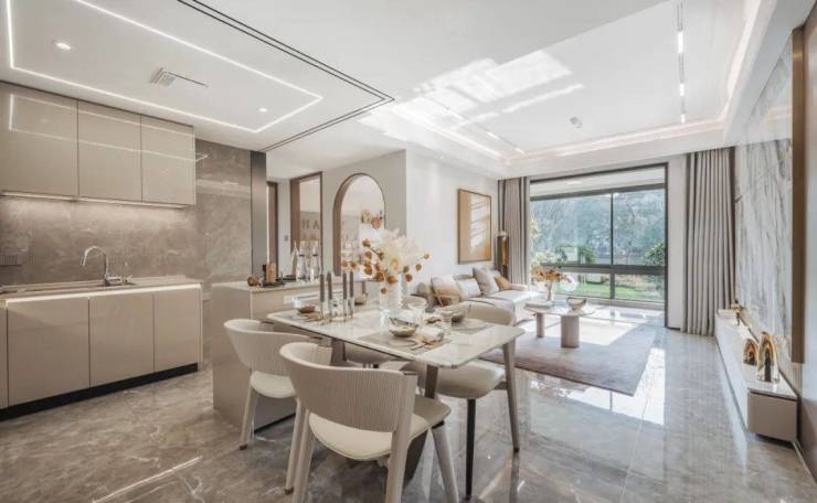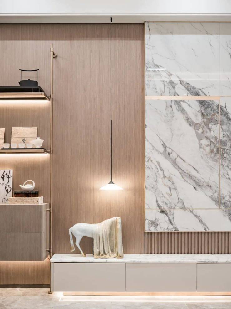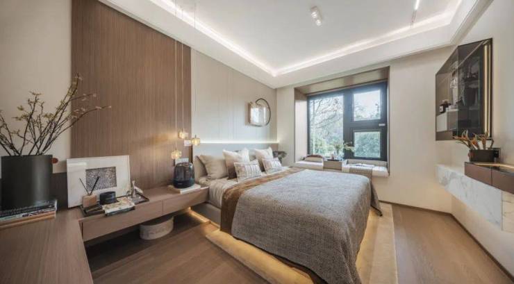 为此项目精选钢木复合门、臻选雅艺壁布、自然木饰面、全景一体化岩板背景墙等精奢材质,搭配充满仪式感的氛围灯带、打磨移门、踢脚线、过门石等每一处细节。同频全球当代极简审美的艺术美宅呼之欲出!
