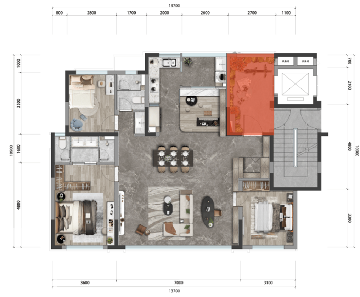 配置比肩甚至超越180㎡级别的大平层,且每个空间的尺寸也堪比大平层的尺度。