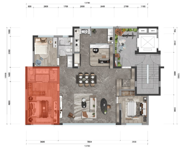 ②7.7米开间客厅区域增加一房,直接四房秒变五房。