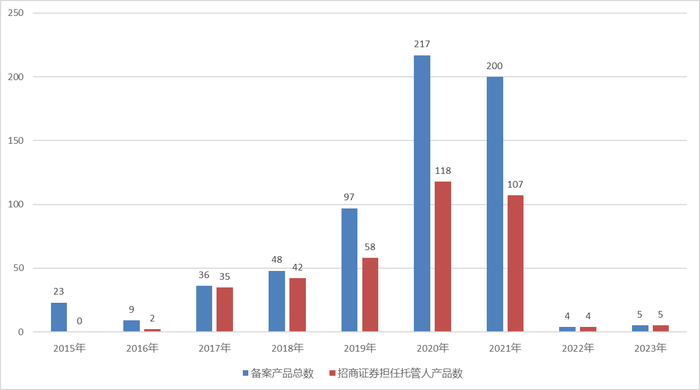 分年度来看,其中2017年和2018年幻方量化备案的产品分别有97.22%和87.5%托管人为招商证券,2019年至2021年三年大扩张期间,由招商证券担任托管人的产品占比也都在50%以上,幻方量化开始主动控制规模以后,公司2022年和2023年累计备案的9只产品托管人均为招商证券。