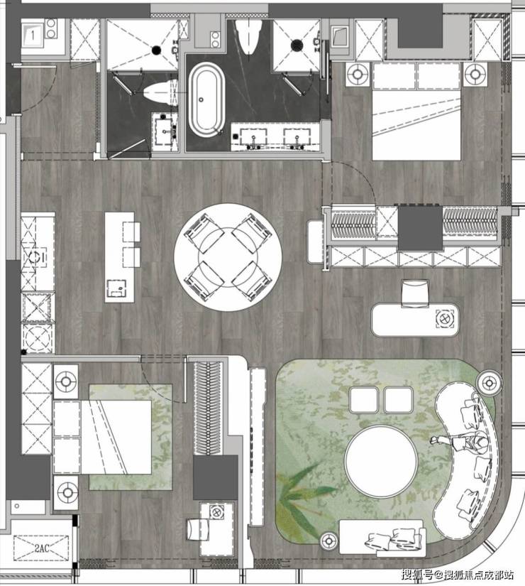 空间魔法:建面69㎡实得100㎡,开放式厨房+功能性吧台,客餐厨一体化设计,独立衣帽间+豪华卫浴四件套;