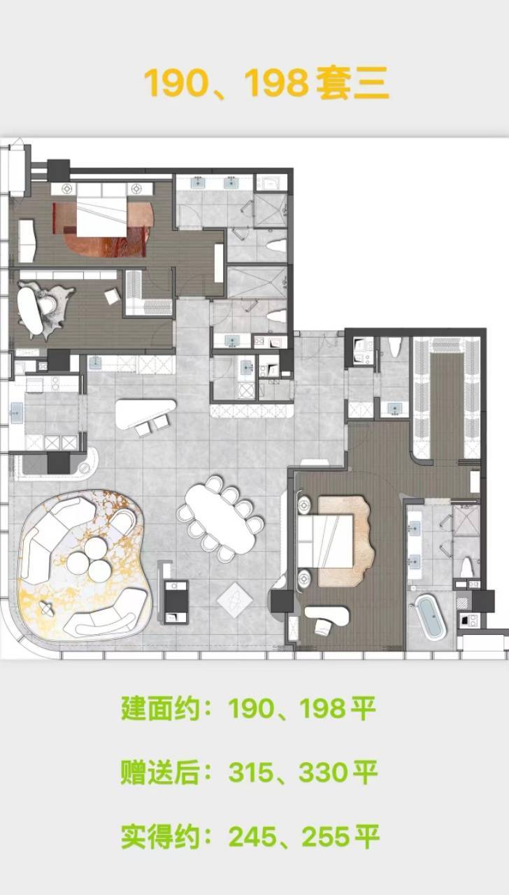 价格区间:精装均价55,000-88,000元/㎡,总价300-1800万。得益于40%-50%高赠送率,实得单价可低至30,000元/㎡(如198㎡户型实得超300㎡)。