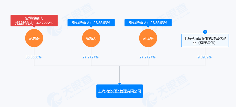 公开资料显示,靖奇投资为量化私募,成立于2015年,法定代表人、董事长、总经理均为范思奇。据天眼查,目前公司股东包括三位,即范思奇、唐靖人和茅诺平,其中股权占比最高的是范思奇。