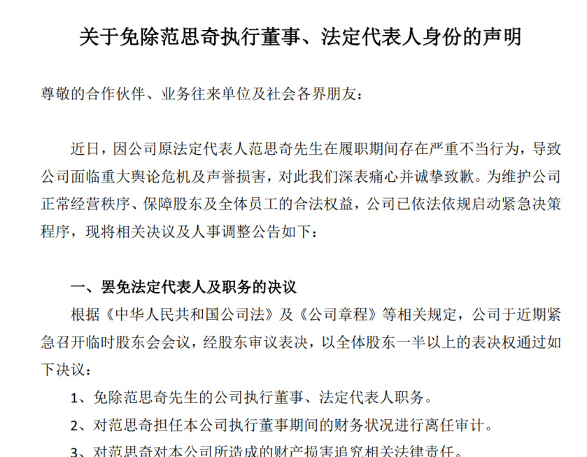 《声明》强调,公司已于今年6月通过律师函形式,正式要求相关人员归还印章,并于6月底向公安机关重新备案法人印章。目前,公司印章由法人范思奇依法管理,任何他人持有并使用的所谓“公司印章”,均属伪造或非法占有,其行为及所形成文书,公司一律不予承认,亦不承担任何法律后果。
