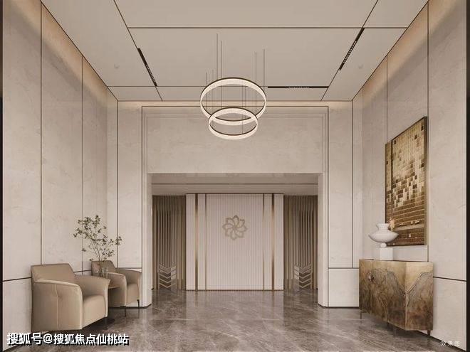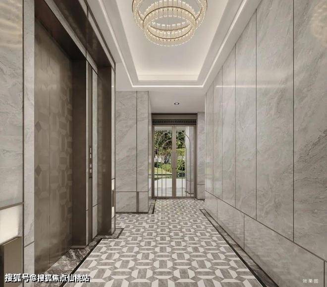 再次,项目首层大堂与电梯轿厢品质感拉满。首层入户大堂,石材搭配金属装饰条的地面、墙面,空间宽敞气派,质感十足。
