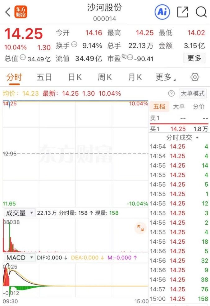今天一早,沙河股份即明显异动,股价大幅高开之后,快速涨停。几经波折之后,封死涨停板。跟随沙河股份涨停脚步的还有另外两只股票:深振业A和深物业A。深深房A和深纺织A也大幅拉升。