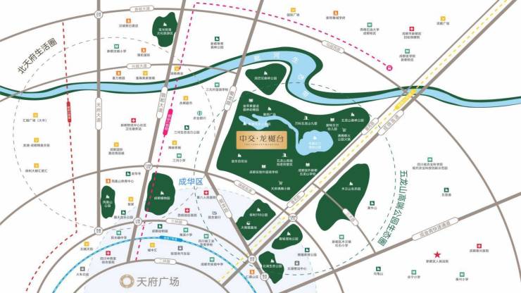 【全维交通】地铁3号线、地铁23号线(规划中,规划有五龙山站)、新都东站(高铁站)、蜀龙路、蓉都大道、绕城高速、成绵高速