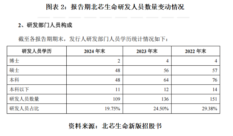 值得注意的是,报告期各期,北芯生命具备博士学历的研发人员分别有4人、4人、2人;具备硕士学历的研发人员分别有57人、56人、48人;具备本科学历的研发人员分别有76人、64人、48人。