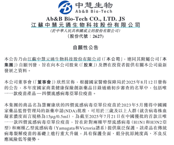 中慧生物8月13日发布自愿性公告,该公告显示,根据国家医疗保障局在2025年8月12日发布的公告,本年度国家商业健康保险创新药品目录通过初步审查的名单中,包括唯一一款疫苗产品——四价流感病毒亚单位疫苗。