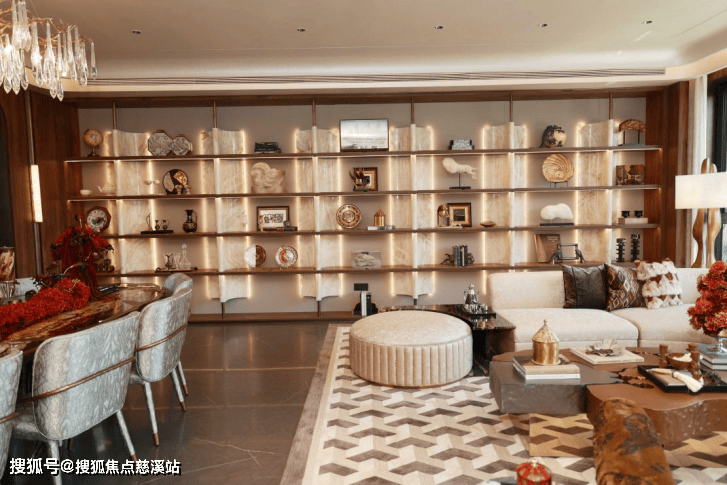 居住空间以“美拉德”设计语言为基调,打造艺术化生活场域。采用棕色偏中性化的色彩,以精致的皮革搭配大理石点缀拉丝香槟金,层次的叠加使得空间感更加丰富,呈现一种高级的复古摩登感。多套房设计,满足家族多代共居的私密需求,约40㎡主卧更以约7米的观景窗,阔绰衣帽间、双卫浴等配置,重构叠拼生活尺度。