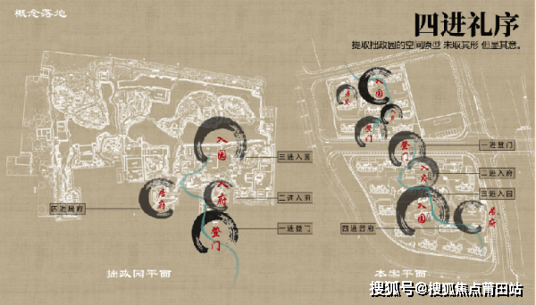 【景观价值】桃源美景之境,拙政园意象 四进礼序:开门入雅、恭王府穿堂客厅、重檐高门、显赫门庭;四大风水演绎:五福迎宾、步步高升、 财聚前庭、 吉祥照壁,以苏州拙政园为范本,叠山理水,步移景异的游园风景。