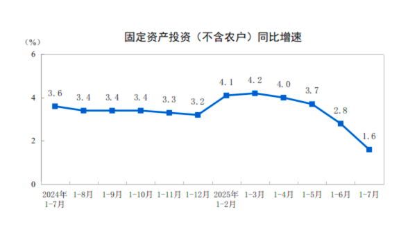 国家统计局8月15日发布的数据显示,7月规模以上工业增加值同比增长5.7%,增速较6月放缓1.1个百分点,社会消费品零售总额同比增长3.7%,增速较6月回落1.1个百分点。1-7月,全国固定资产投资同比增长1.6%,涨幅较1-6月回落1.2个百分点。