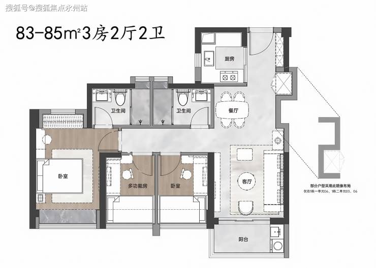 建面约83-85㎡3房2厅2卫,是项目的主力户型。对生活品质有更高追求的朋友,可以首选这个户型。