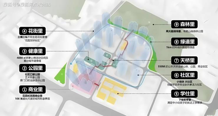 规划了约500米的立体城市连廊系统,串联全龄教育、精致商业、品质人居、活力运动、公园休闲等功能板块。