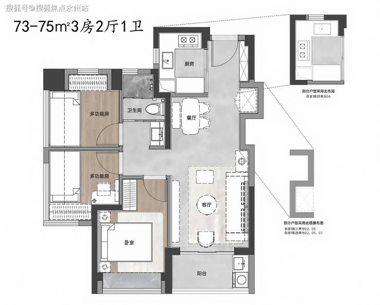 建面约73-75㎡3房2厅1卫,是项目很受欢迎的户型。这款户型最大的亮点就是做出了市面上85平三房的既视感,实用率高,实属难得。
