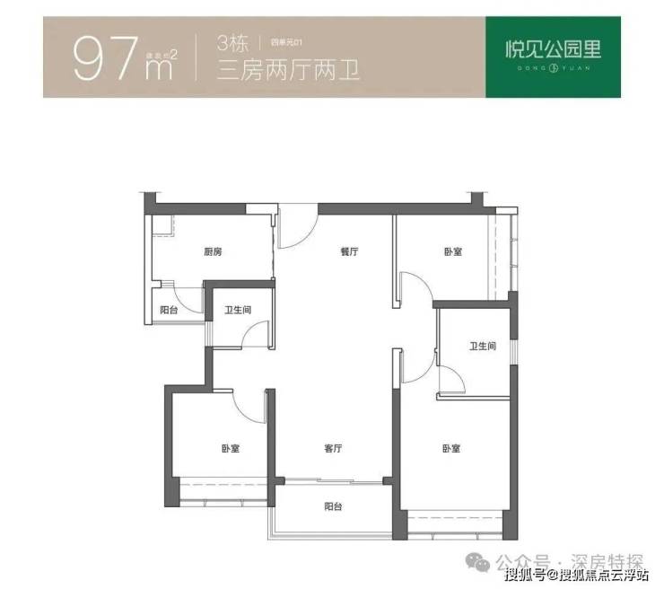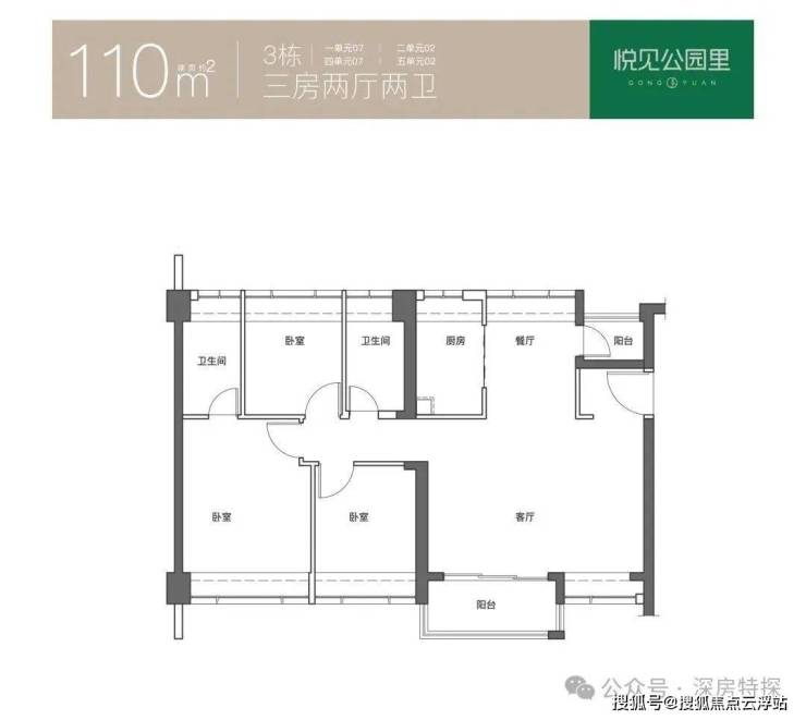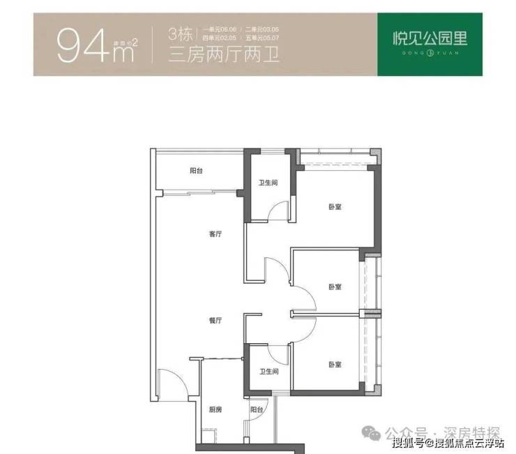 面积有85-88㎡的3房2厅1卫,91-94-95-97-110㎡的3房2厅2卫,120㎡的4房2厅2卫户型