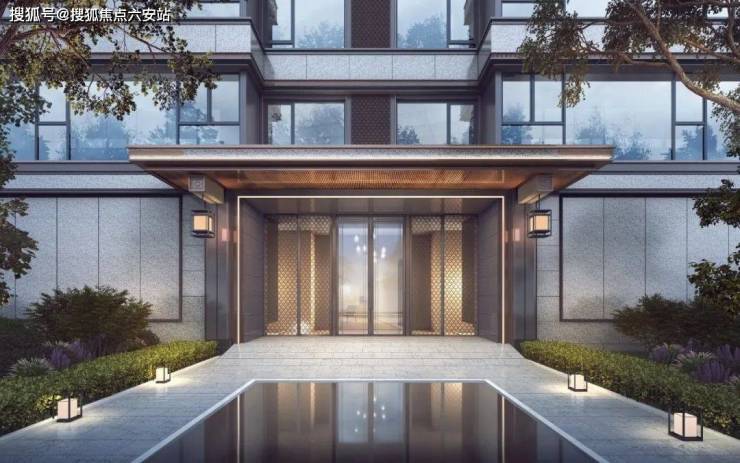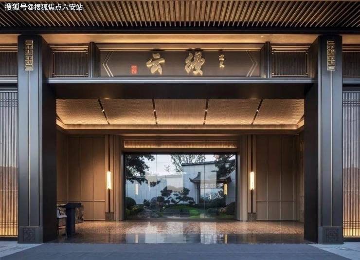 迎面是主入口约59米宽、12米高的新中式大门,九脊歇山顶大气尊贵,两株罗汉松分列左右,一眼望去气势恢宏。