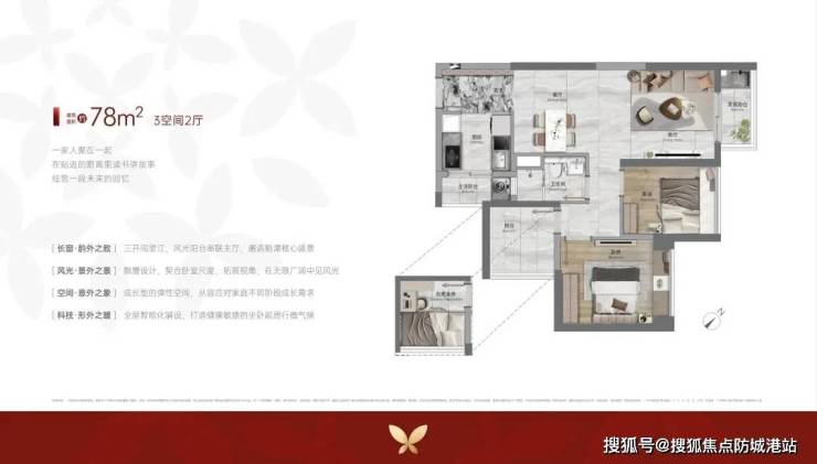 得房率超85%:通过优化飘窗、阳台设计,78㎡实用面积堪比片区90㎡户型。