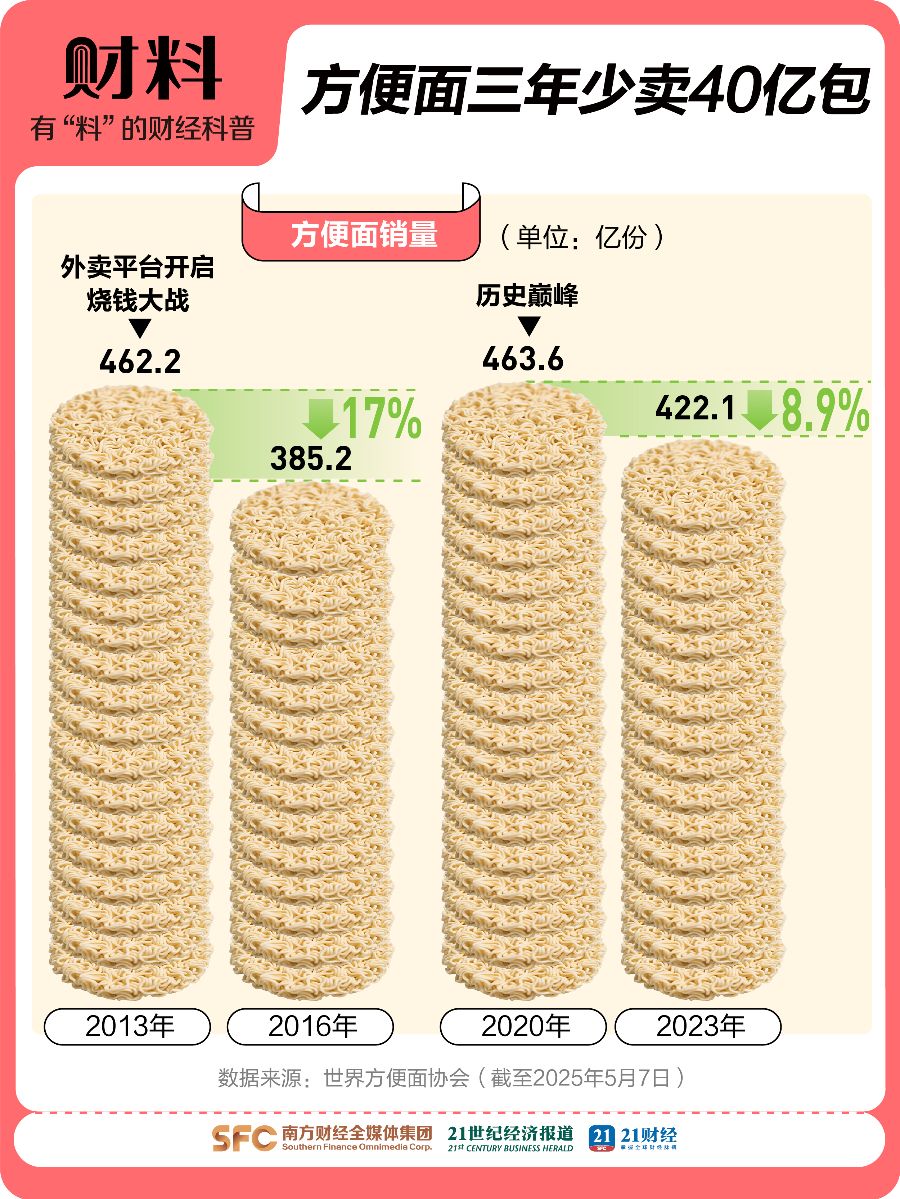 《21财料》观察到,据世界方便面协会数据统计,2020—2023年,方便面3年消费量减少40亿包,2024年方便面消费量跌至438亿包,2025年Q2方便面销售额还在同比下滑8.9%,曾经的国民速食,光环似乎渐渐褪去。