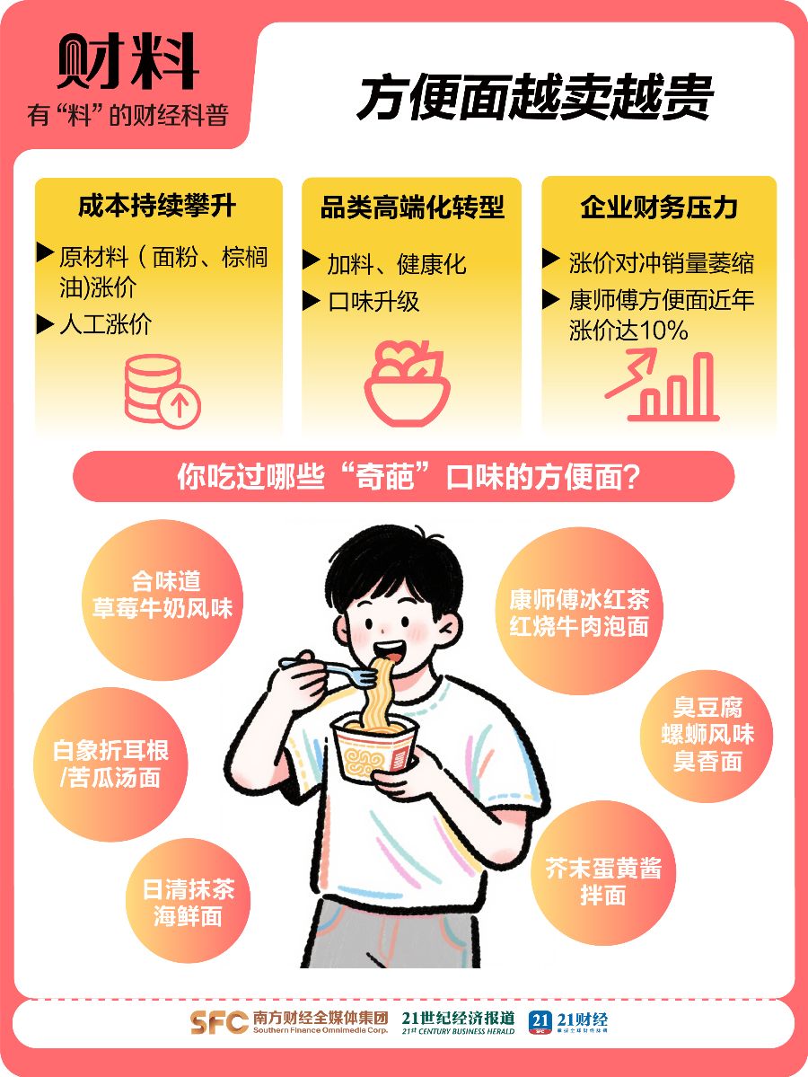 另一方面,方便面也开始越卖越贵了,曾经5元以下能拿下的经典款,如今动辄涨到6元,轻奢款方便面已经卖到15—20元价格带,康师傅与山姆合作的高端款方便面甚至卖出79.9元的价格。