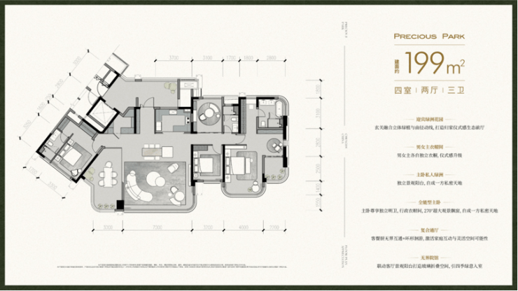 室内四花园设计:主城唯一“户内户外双花园”体验,如约183㎡户型配备约7米景观阳台。