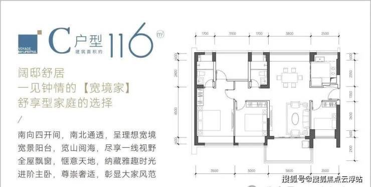 116㎡的4房2厅2卫,C户型,设计的是竖厅南北通透格局,客厅3.8米开间,四开间朝南,4个卧室分别做到了主卧17.85㎡/次卧11.4㎡/次卧9.3㎡/次卧8㎡(包含墙体飘窗),得房率约:93.13%(包含赠送),阳台主朝西南、东南或正南向。