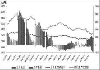 图为2023年6月—2024年12月玉米、豆粕主力合约价格及基差走势
