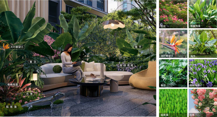 数十种特选植物 ,把家搬进自然里,邂逅生活的舒适与优雅;精选众多云南本地植物,运用自然种植手法,模拟本土自然生境,为您营造出沉浸且松弛的绝佳感受