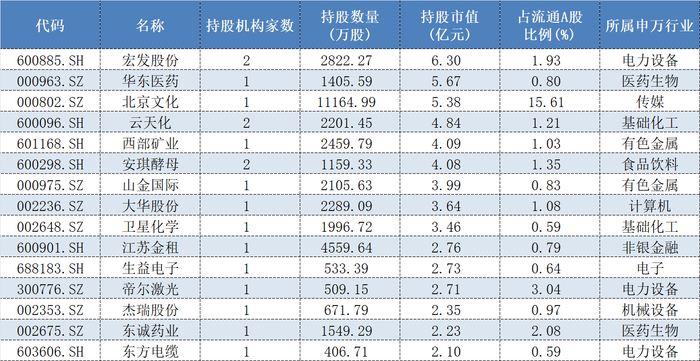 截至8月19日,已经有58只个股中报的前十大流通股东中新进出现了险资的身影,其中15只个股持仓市值超过了2亿元,宏发股份(600885.SH)、华东医药(000963.SZ)、北京文化(000802.SZ)三只个股被新进入前十大流通股东中的险资期末持仓市值分别为6.3亿元、5.67亿元和5.38亿元。