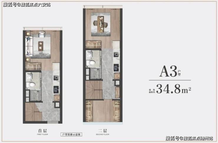 项目以“双钥匙”创新设计,破解传统小户型局限,实现“一层投入,双层享”的价值突破。建筑面积约34-59㎡的灵动户型,通过上下独立入户设计,天然具备功能分隔的可能性,为空间应用拓展出丰富维度。