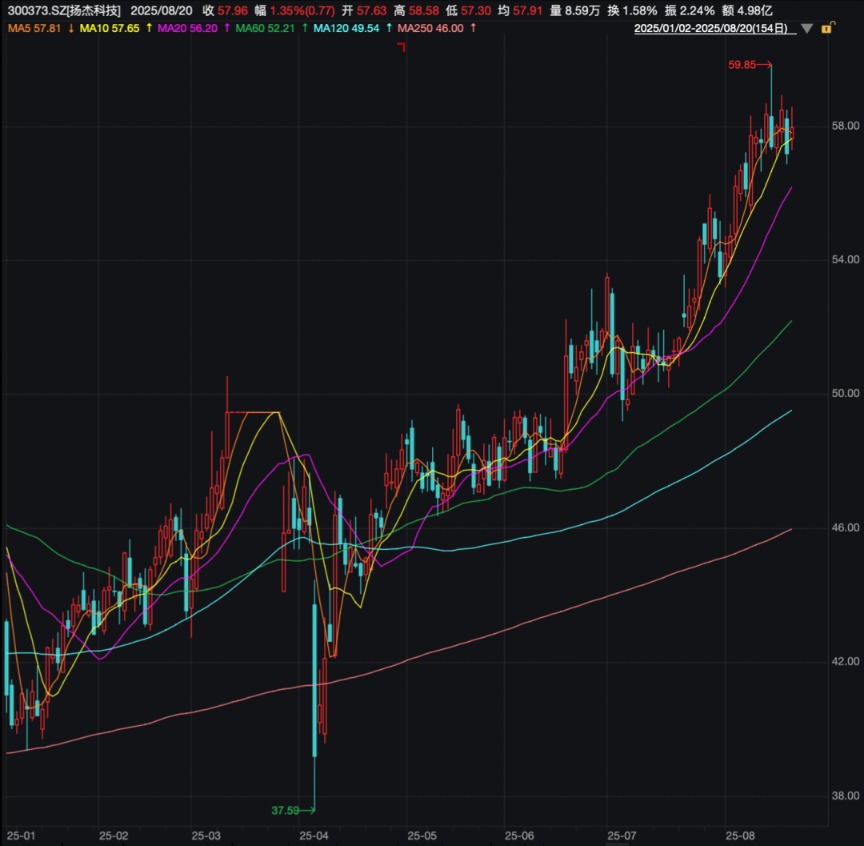 从市场表现来看,在今年4月暴跌至37.59元/股后,扬杰科技股价一路震荡攀升。截至发稿,股价涨至58元/股附近,年初至今涨幅在34%左右。