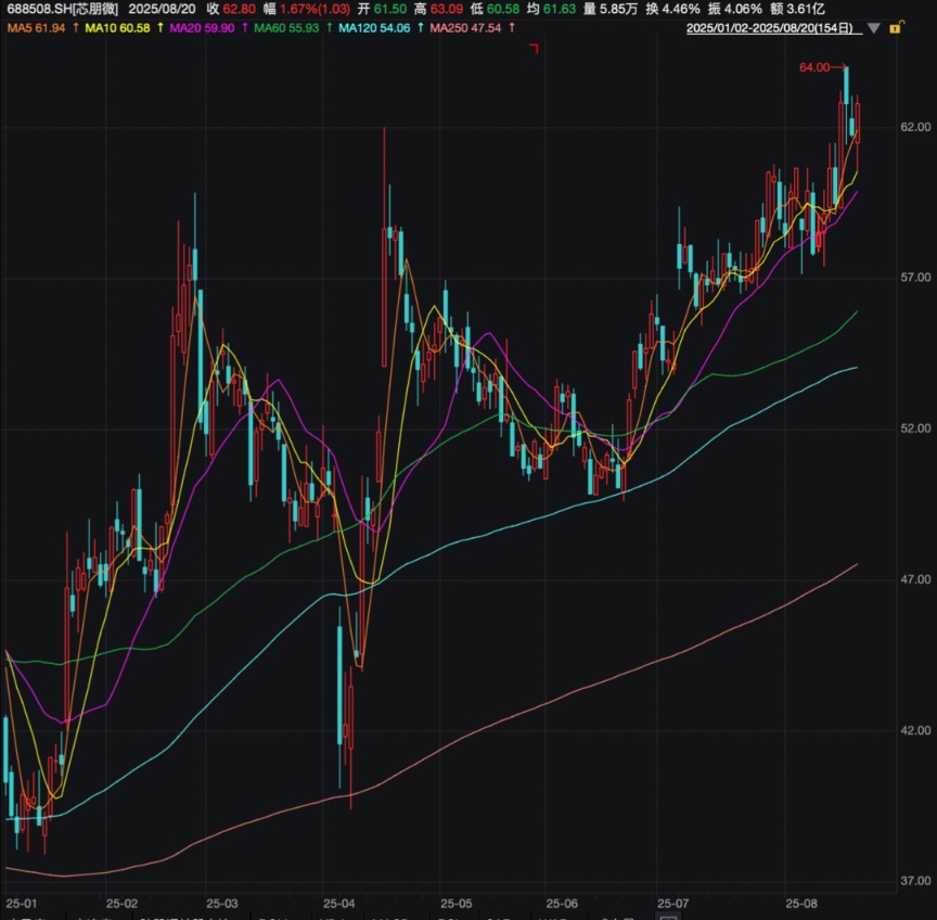 芯朋微是一家功率集成电路设计的高科技企业,今年上半年实现营业收入6.36亿元,同比增长40.32%;归母净利润为0.90亿元,同比增长106.02%。年初至今芯朋微股价上涨47%左右。