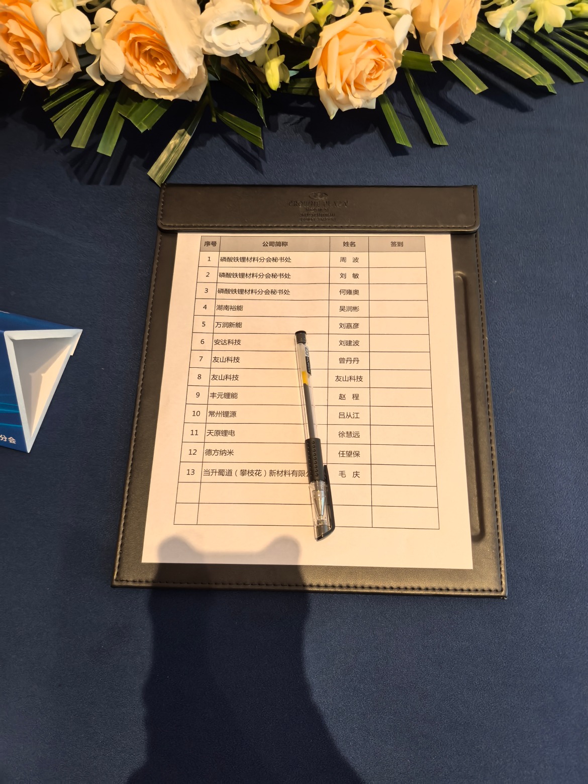 根据记者在现场获得的签到名单,本次参会方共计13人次,其中3名为磷酸铁锂材料分会秘书处工作人员,其余10家为磷酸铁锂产业链企业,包括湖南裕能(301358.SZ)、万润新能(688275.SZ)、安达科技(830809.BJ)、德方纳米(300769.SZ)以及当升科技(300073.SZ)旗下的当升蜀道(攀枝花)新材料有限公司5家上市公司或上市公司子公司,以及友山科技、丰元锂能、常州锂源、天原理电。