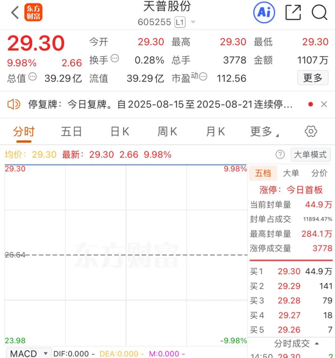 天普股份自8月15日停牌,而后8月18日宣布继续停牌,于8月22日复牌。8月22日,天普股份开盘即封死涨停板,截至当日收盘,天普股份报收29.30元/股,最新市值为39.29亿元。