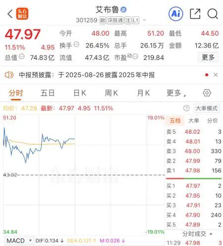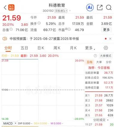 8月22日,参股中昊芯英的科德教育、艾布鲁开盘行情异动。截至早盘收盘,科德教育20%涨停,艾布鲁大涨11.51%。