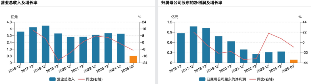 从业绩来看,2023年至2024年以及2025年一季度,天普股份营业收入分别为3.48亿元、3.42亿元、0.81亿元,净利润分别为0.31亿元、0.33亿元、0.09亿元。