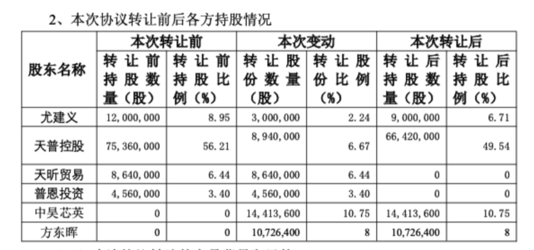8月21日,天普股份公告称,公司控股股东天普控股、天昕贸易、尤建义拟以协议转让方式合计向中昊芯英转让公司10.75%股份。同时,普恩投资、天昕贸易拟以协议转让方式向方东晖合计转让公司8%股份。