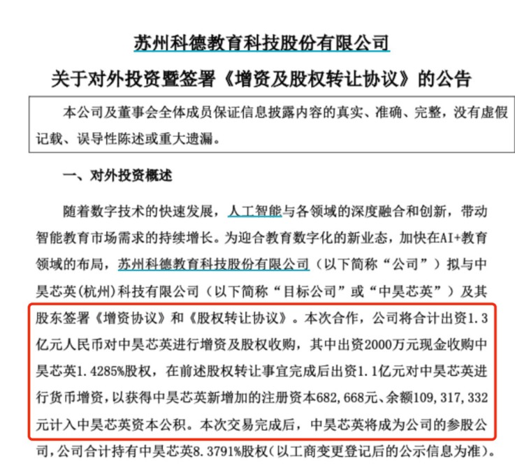 2023年4月9日,职教领域上市企业科德教育披露公告称,为顺应教育数字化的新业态,加快在AI+教育领域的布局,公司拟与中昊芯英及其股东签署《增资协议》和《股权转让协议》。