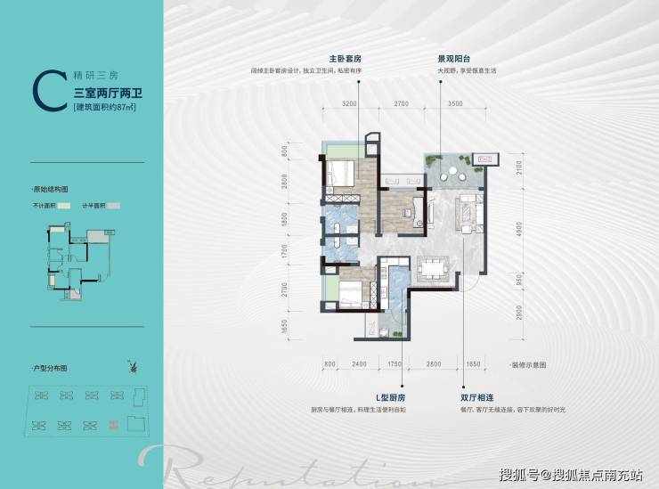 建面87,套内70,横厅,南北向(三房二厅二卫)实得83左右
