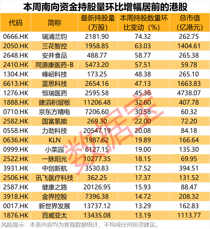 从持股量变化来看,本周34股的南向资金持股量环比增长超10%,其中瑞浦兰钧、三花智控、安井食品、同源康医药-B持股量环比增长50%以上,峰岹科技、蓝思科技、恒瑞医药持股量环比增幅在40%以上。