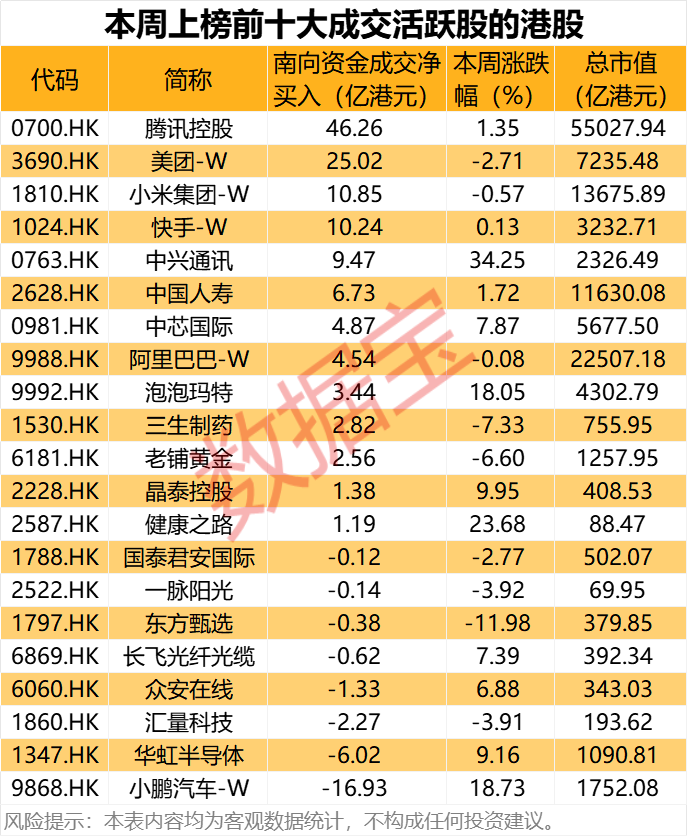 从行情上来看,前十大活跃个股中,中兴通讯本周涨幅最高,累计涨幅达到34.25%,健康之路、小鹏汽车-W、泡泡玛特紧随其后,分别达到23.68%、18.73%、18.05%。